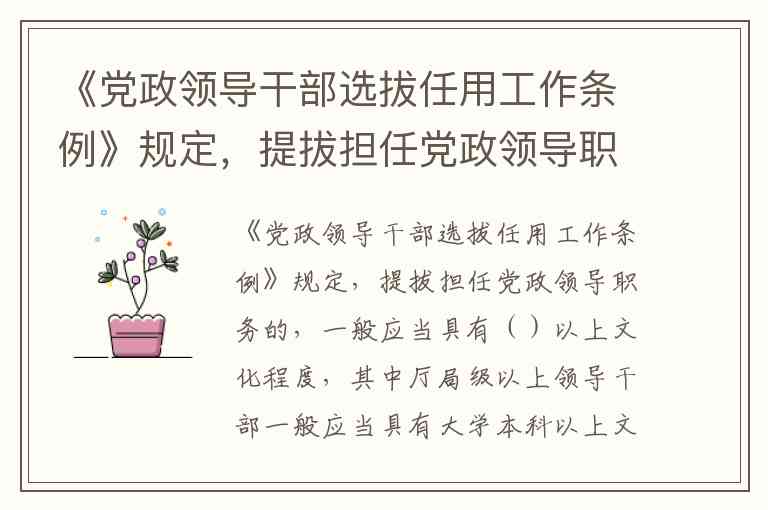 《党政领导干部选拔任用工作条例》明确规定,提拔担任党政领导职务的,一般应当具有大学专科以上文化程度,其中厅局级以上领导干部需达到大学本科以上文化程度。这一要求体现了干部队伍"四化"方针中对知识化的基本标准,确保不同层级领导干部具备履行职责所需的文化素养。