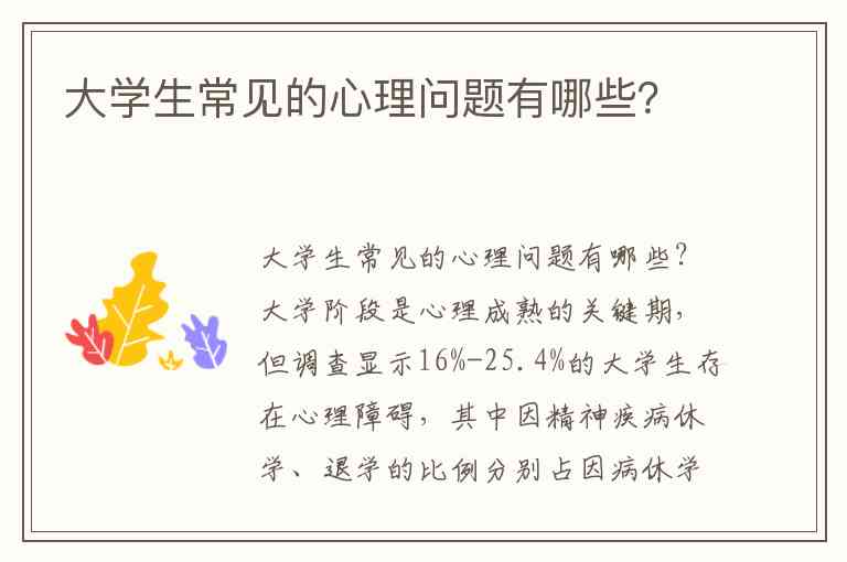 大学阶段是心理成熟的关键期,但调查显示16%-25.4%的大学生存在心理障碍,其中因精神疾病休学、退学的比例分别占因病休学、退学总数的37.9%和64.4%。这些问题往往交织着环境适应、学业压力、人际关系等多重因素,呈现出鲜明的阶段性特征。