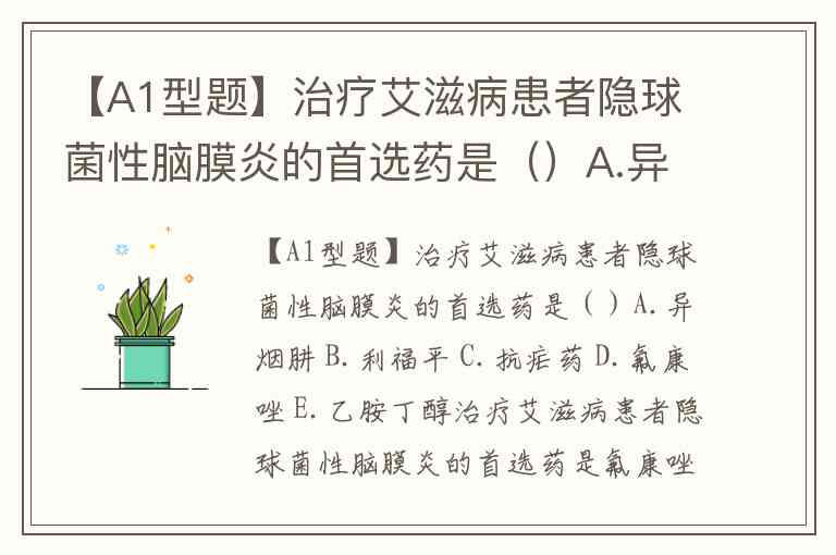 【A1型题】治疗艾滋病患者隐球菌性脑膜炎的首选药是()A.异烟肼 B.利福平 C.抗疟药 D.氟康唑 E.乙胺丁醇
