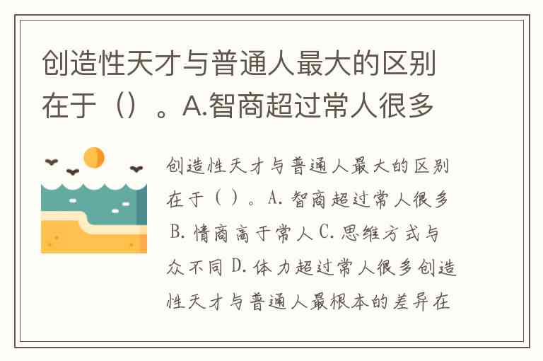 创造性天才与普通人最大的区别在于()。A.智商超过常人很多 B.情商高于常人 C.思维方式与众不同 D.体力超过常人很多