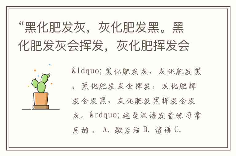 “黑化肥发灰,灰化肥发黑。黑化肥发灰会挥发,灰化肥挥发会发黑,灰化肥发黑挥发会发灰。”这是汉语发音练习常用的 。 A. 歇后语 B. 谚语 C. 绕口令 D. 成语