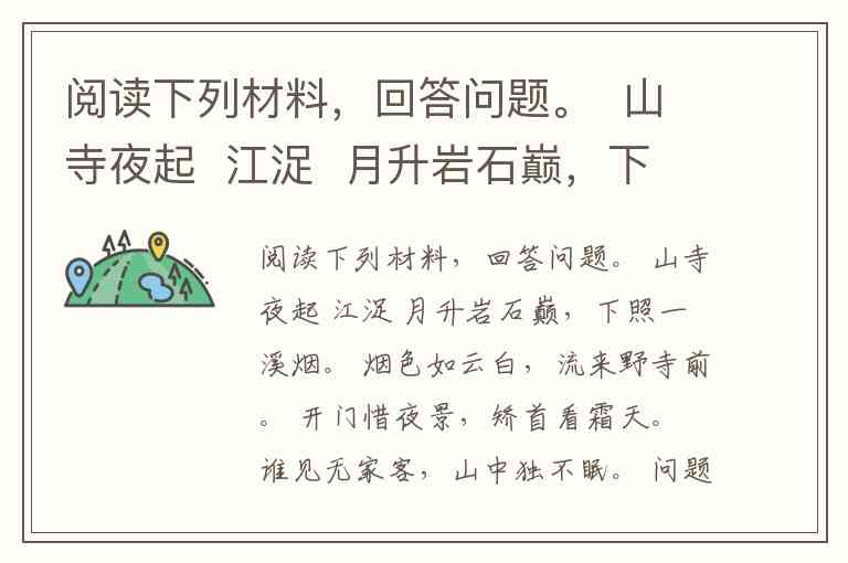 阅读下列材料,回答问题。 山寺夜起 江浞 月升岩石巅,下照一溪烟。 烟色如云白,流来野寺前。 开门惜夜景,矫首看霜天。 谁见无家客,山中独不眠。 问题: (1)三、四两句中的“烟”有哪些特点?诗人是如何描写的? (2)结合全诗分析诗人“不眠”的原因。
