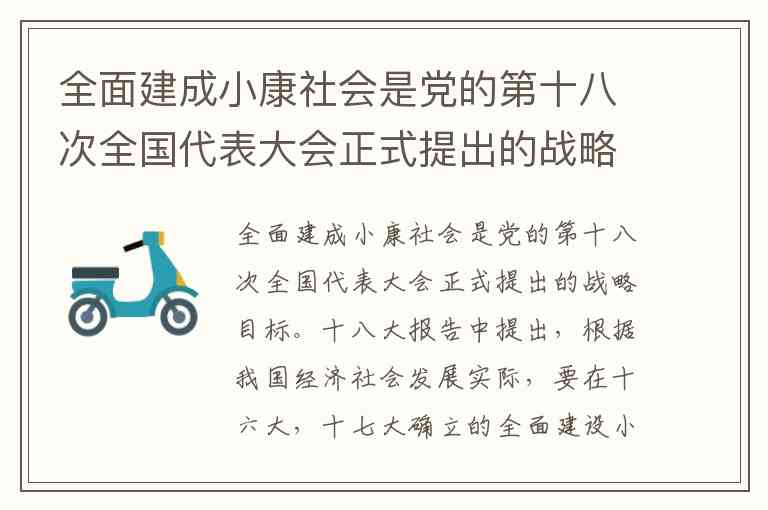 全面建成小康社会是党的第十八次全国代表大会正式提出的战略目标。十八大报告中提出,根据我国经济社会发展实际,要在十六大,十七大确立的全面建设小康社会目标的基础上努力实现新的要求:经济持续健康发展,转变经济发展方式取得重大进展,在发展平衡性,协调性,可持续性明显增强的基础上,实现国内生产总值和城乡居民人均收入比2010年翻一番;人民民主不断扩大;文化软实力显著增强;人民生活水平全面提高;资源节约型,环境友好型社会建设取得重大进展。