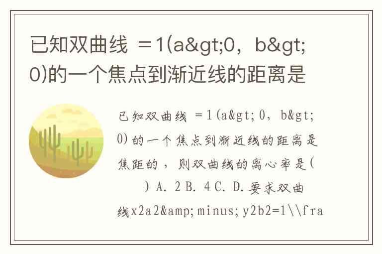 要求双曲线()的离心率,需结合焦点到渐近线的距离与焦距的关系推导。双曲线中,焦点坐标为(),渐近线方程为,焦距为,离心率。