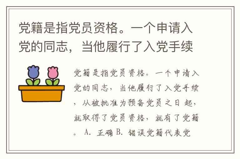 党籍是指党员资格。一个申请入党的同志,当他履行了入党手续,从被批准为预备党员之日 起,就取得了党员资格,就有了党籍。 A. 正确 B. 错误