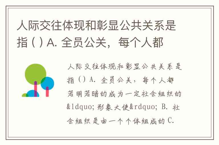 人际交往体现和彰显公共关系的核心在于全员公关理念,即每个个体都在无意中成为所属社会组织的“形象大使”。这一观点在多项权威测试和理论中被明确阐述,例如智慧树网课《公共关系与人际交往能力》的章节测试直接将“全员公关,每个人都若明若暗的成为一定社会组织的‘形象大使’”列为标准答案。其本质是强调个体行为与组织形象的关联性——当一个人以组织成员身份开展社交时,其言行举止会被公众解读为组织态度的缩影,进而影响外界对该组织的评价。