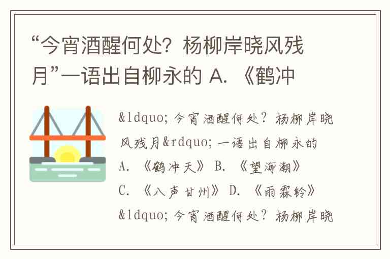 “今宵酒醒何处?杨柳岸晓风残月”一语出自柳永的 A. 《鹤冲天》 B. 《望海潮》 C. 《八声甘州》 D. 《雨霖铃》