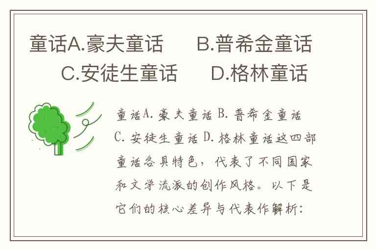 童话A.豪夫童话 B.普希金童话 C.安徒生童话 D.格林童话