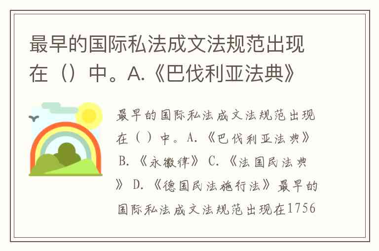 最早的国际私法成文法规范出现在()中。A.《巴伐利亚法典》 B.《永徽律》 C.《法国民法典》 D.《德国民法施行法》