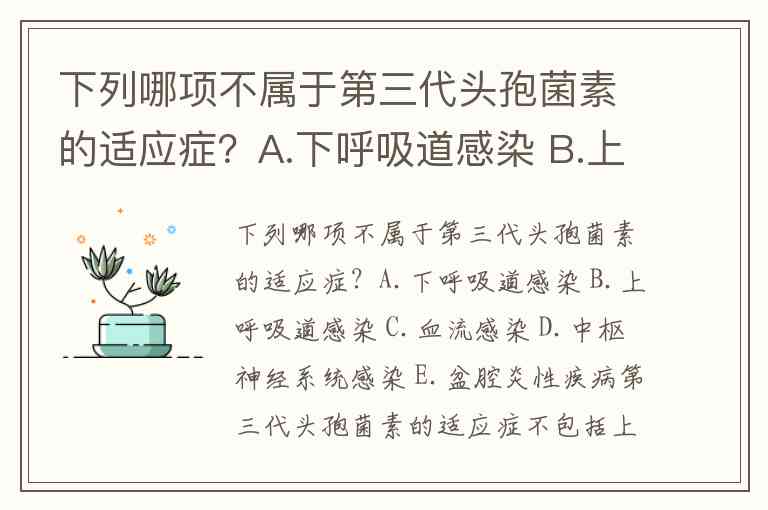下列哪项不属于第三代头孢菌素的适应症?A.下呼吸道感染 B.上呼吸道感染 C.血流感染 D.中枢神经系统感染 E.盆腔炎性疾病