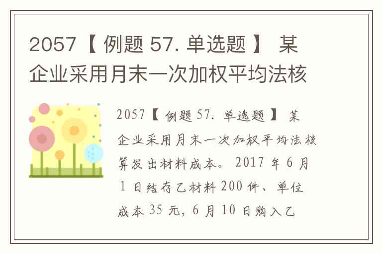 2057【 例题 57. 单选题 】 某企业采用月末一次加权平均法核算发出材料成本。 2017 年 6 月 1 日结存乙材料 200 件、单位成本 35 元, 6 月 10 日购入乙材料 400 件、单位成本 40 元, 6 月 20 日购入乙材料 400 件、单位成本 45 元。当月发出乙材料 600 件。不考虑其他因素,该企业 6 月份发出乙材料的成本为 ( ) 元。 A. 24600 B. 25000 C. 26000 D. 23000