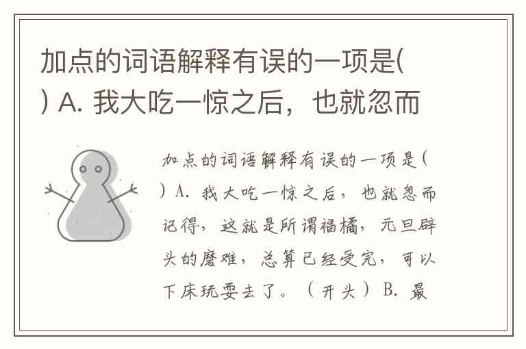 加点的词语解释有误的一项是( ) A. 我大吃一惊之后,也就忽而记得,这就是所谓福橘,元旦辟头的磨难,总算已经受完,可以下床玩耍去了。(开头) B. 最讨厌的是常喜欢切切察察。(拟声词,形容细碎的说话声音) C. 我似乎遇着了一个霹雳,全体都震悚起来。(大家) D. 我惧惮她什么呢!(害怕)