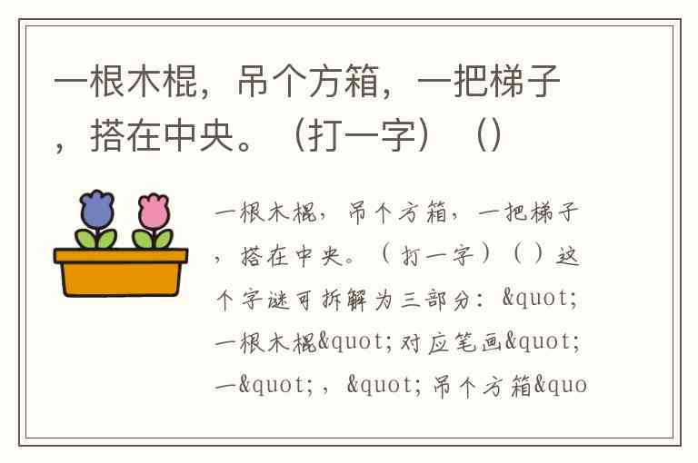 这个字谜可拆解为三部分:"一根木棍"对应笔画"一","吊个方箱"指方形的"口","一把梯子"则形似"人"(人字形梯子)。关键在"搭在中央"——梯子需置于木棍与方箱之间。组合起来,上方"人"(梯子)、中间"一"(木棍)、下方"口"(方箱),恰好构成"合"字。