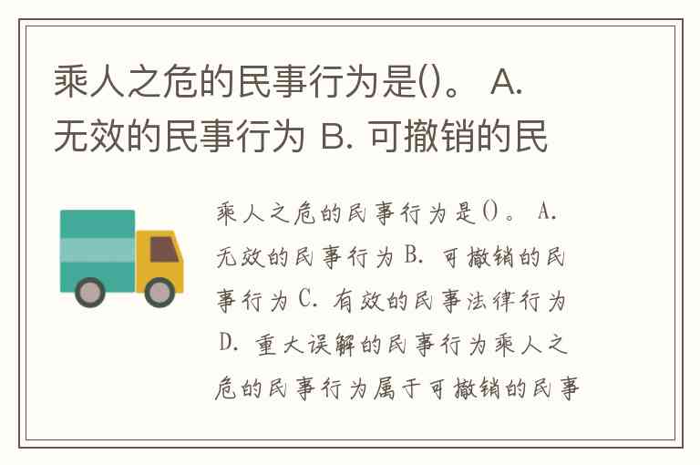 乘人之危的民事行为是()。 A. 无效的民事行为 B. 可撤销的民事行为 C. 有效的民事法律行为 D. 重大误解的民事行为