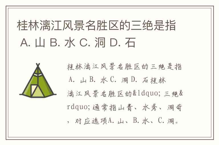 若从景区细分角度看,部分溶洞(如银子岩)内部也有“三绝”(音乐石屏、广寒深宫、雪山飞瀑),但这属于单一景点的特色,而非漓江风景名胜区的整体概括。因此,综合旅游常识与资料依据,A.山、B.水、C.洞是对“漓江三绝”的最合理解答。