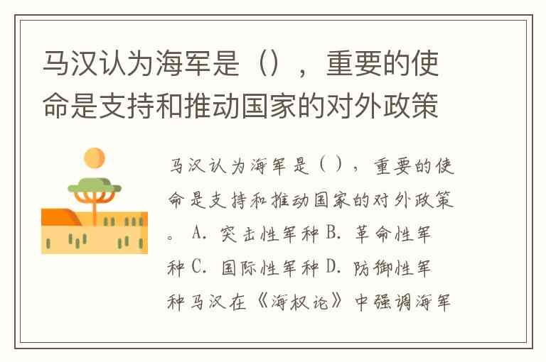马汉认为海军是(),重要的使命是支持和推动国家的对外政策。 A. 突击性军种 B. 革命性军种 C. 国际性军种 D. 防御性军种