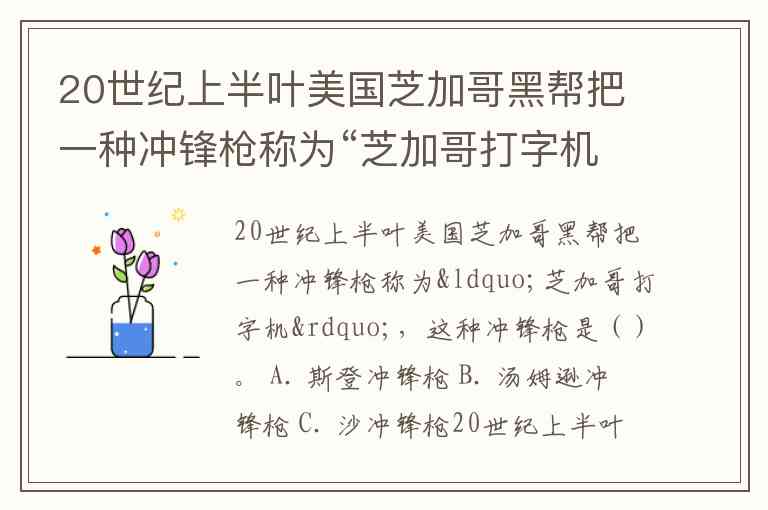 20世纪上半叶美国芝加哥黑帮把一种冲锋枪称为“芝加哥打字机”,这种冲锋枪是()。 A. 斯登冲锋枪 B. 汤姆逊冲锋枪 C. 沙冲锋枪