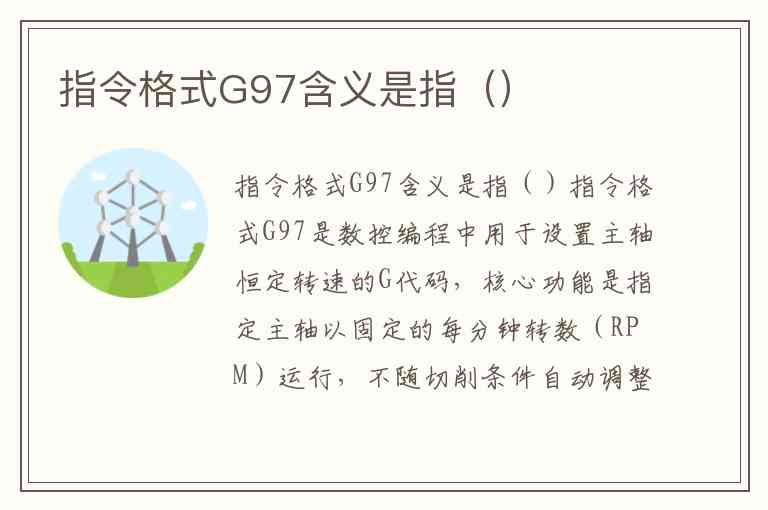 指令格式G97是数控编程中用于设置主轴恒定转速的G代码,核心功能是指定主轴以固定的每分钟转数(RPM)运行,不随切削条件自动调整。作为模态指令,它会持续生效直至被G96(恒切削速度模式)等其他主轴控制指令替代。