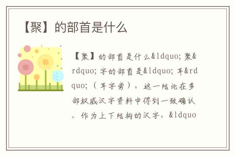 “聚”字的部首是“耳”(耳字旁),这一结论在多部权威汉字资料中得到一致确认。作为上下结构的汉字,“聚”的上部为“耳”,下部为“取”的变形,总笔画数为14画,其中部首“耳”本身占6画,部外笔画为8画。