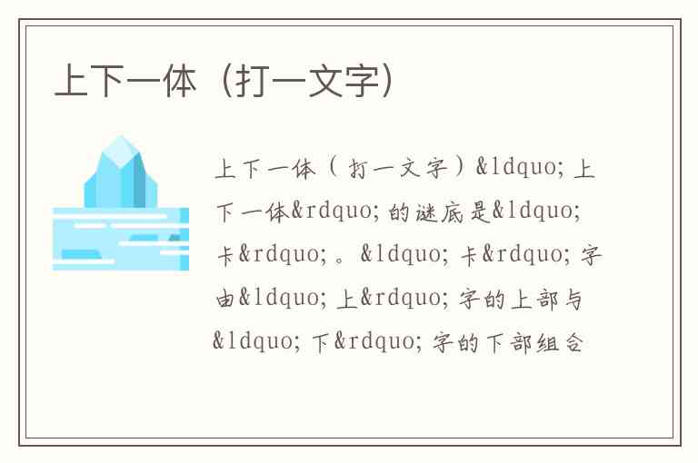 “卡”字由“上”字的上部与“下”字的下部组合而成,直观呈现“上下”两部分融合为“一体”的形态;同时,“卡”字本身有“卡住、阻塞”之意,暗含上下连接、无法分离的状态,与谜面描述完全契合。