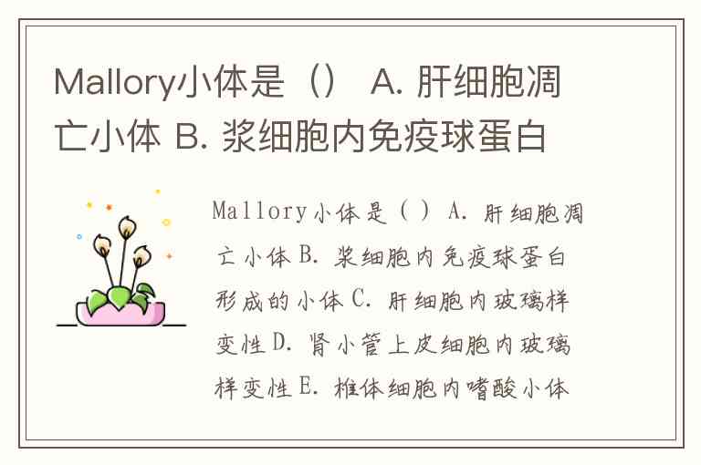 Mallory小体是() A. 肝细胞凋亡小体 B. 浆细胞内免疫球蛋白形成的小体 C. 肝细胞内玻璃样变性 D. 肾小管上皮细胞内玻璃样变性 E. 椎体细胞内嗜酸小体