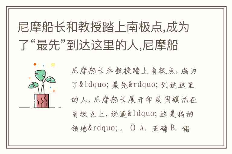 尼摩船长和教授踏上南极点,成为了“最先”到达这里的人,尼摩船长展开印度国旗插在南极点上,说道“这是我的领地”。() A. 正确 B. 错误