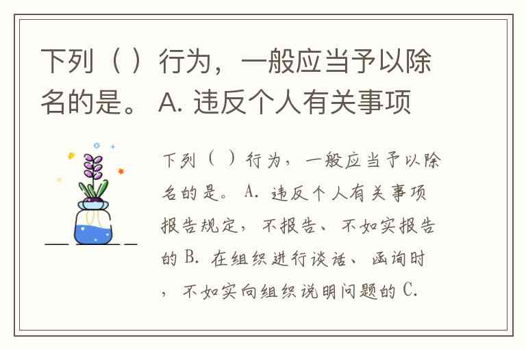 下列( )行为,一般应当予以除名的是。 A. 违反个人有关事项报告规定,不报告、不如实报告的 B. 在组织进行谈话、函询时,不如实向组织说明问题的 C. 不如实填报个人档案资料的 D. 隐瞒入党前严重错误的
