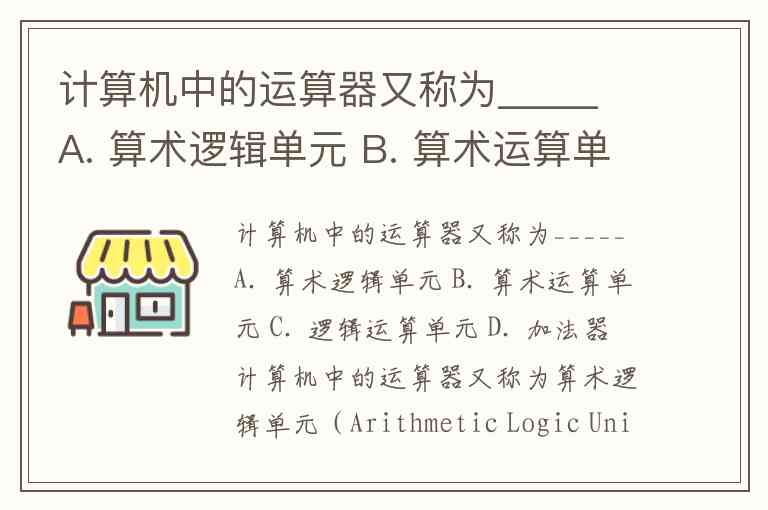 计算机中的运算器又称为_____ A. 算术逻辑单元 B. 算术运算单元 C. 逻辑运算单元 D. 加法器