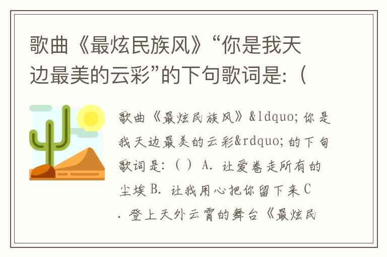 歌曲《最炫民族风》“你是我天边最美的云彩”的下句歌词是:() A. 让爱卷走所有的尘埃 B. 让我用心把你留下来 C. 登上天外云霄的舞台