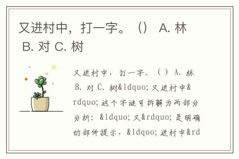 又进村中,打一字。() A. 林 B. 对 C. 树