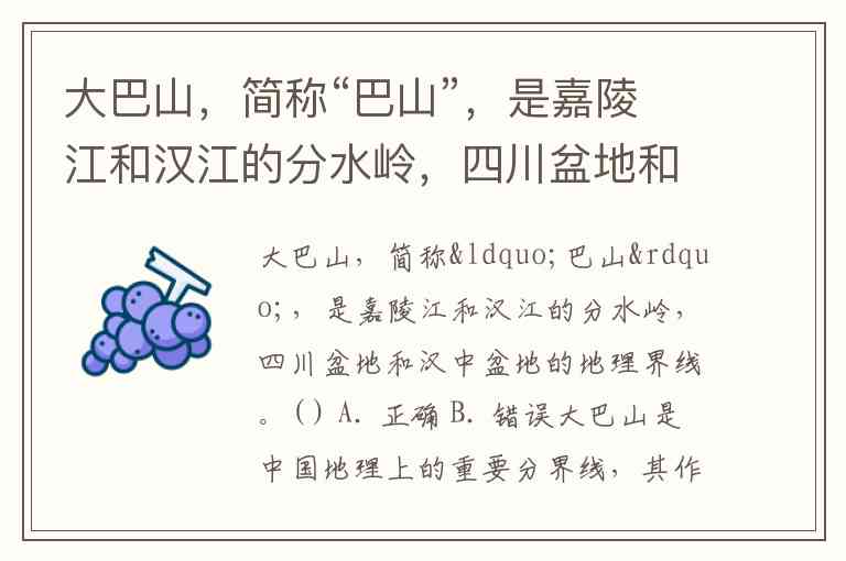 大巴山,简称“巴山”,是嘉陵江和汉江的分水岭,四川盆地和汉中盆地的地理界线。( ) A. 正确 B. 错误