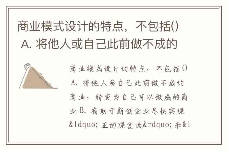 商业模式设计的特点,不包括() A. 将他人或自己此前做不成的商业,转变为自己可以做成的商业 B. 有助于新创企业尽快实现“正的现金流”和“最大化利润” C. 商业模式一旦设计出来,就无需也不能修改 D. 是企业战略设计的基础