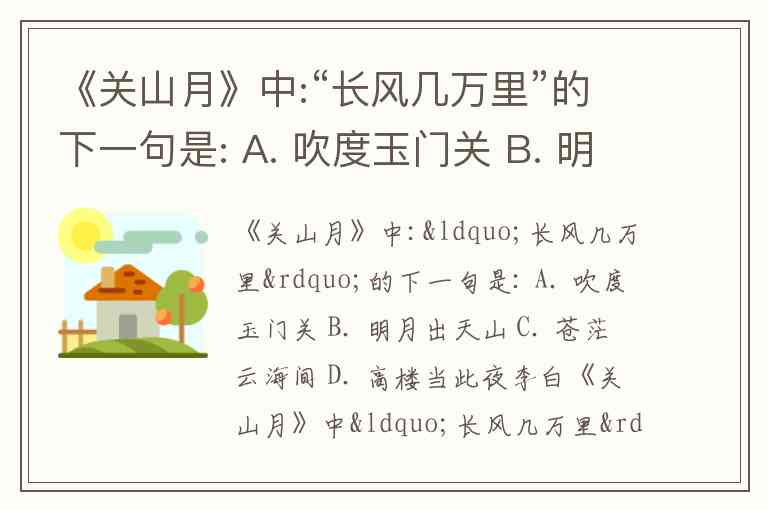 《关山月》中:“长风几万里”的下一句是: A. 吹度玉门关 B. 明月出天山 C. 苍茫云海间 D. 高楼当此夜