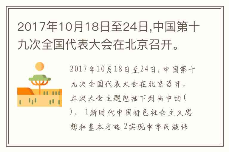 2017年10月18日至24日,中国第十九次全国代表大会在北京召开。本次大会主题包括下列当中的( )。 1新时代中国特色社会主义思想和基本方略 2实现中华民族伟大复兴的中国梦不懈奋斗 3不忘初心,牢记使命,高举中国特色社会主义伟大旗帜 4决胜全面建成小康社会,夺取新时代中国特色社会主义伟大胜利 A. ①②③ B. ①②④ C. ①③④ D. ②③④