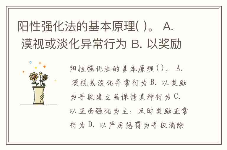 阳性强化法的基本原理( )。 A. 漠视或淡化异常行为 B. 以奖励为手段建立或保持某种行为 C. 以正面强化为主,及时奖励正常行为 D. 以严厉惩罚为手段消除某种行为