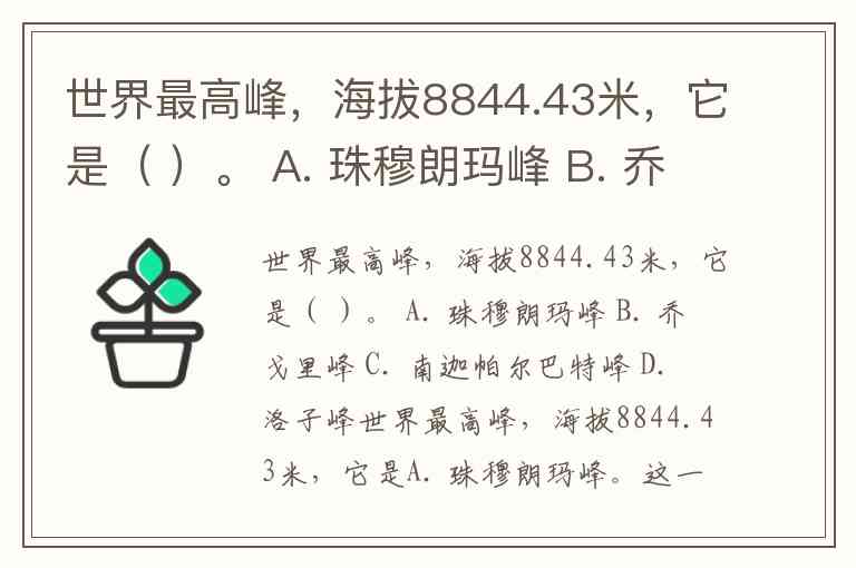 世界最高峰,海拔8844.43米,它是( )。 A. 珠穆朗玛峰 B. 乔戈里峰 C. 南迦帕尔巴特峰 D. 洛子峰