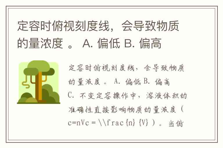 定容操作中,溶液体积的准确性直接影响物质的量浓度()。当俯视容量瓶刻度线时,视线从高处斜向下观察,会使凹液面最低处与刻度线的对齐点低于实际刻度位置,导致操作人员误认为溶液已达到目标体积而提前停止加水。