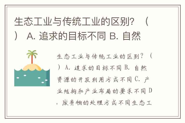生态工业与传统工业的区别?() A. 追求的目标不同 B. 自然资源的开发利用方式不同 C. 产业结构和产业布局的要求不同 D. 废弃物的处理方式不同