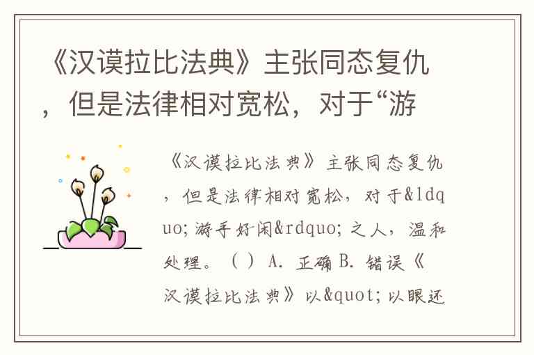 《汉谟拉比法典》主张同态复仇,但是法律相对宽松,对于“游手好闲”之人,温和处理。() A. 正确 B. 错误