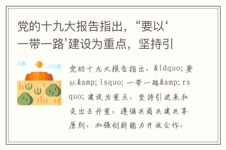 党的十九大报告指出,“要以‘一带一路’建设为重点,坚持引进来和走出去并重,遵循共商共建共享原则,加强创新能力开放合作,形成陆海内外联动、东西双向互济的开放格局”。