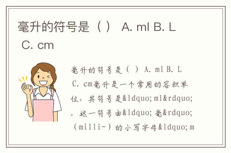 毫升是一个常用的容积单位,其符号是“ml”。这一符号由“毫”(milli-)的小写字母“m”和“升”(liter)的小写字母“l”组合而成,符合国际单位制中关于单位符号的书写规范。
