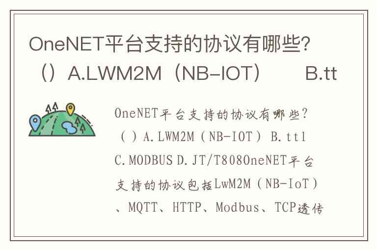 OneNET平台支持的协议包括LwM2M(NB-IoT)、MQTT、HTTP、Modbus、TCP透传和EDP等,覆盖从低功耗广域网到工业控制的多种场景。其中,选项中的A.LWM2M(NB-IOT) 和C.MODBUS是明确支持的协议,而B.ttl(通常指DNS生存时间,非通信协议)和D.JT/T808(交通运输行业标准协议)未在官方文档中提及。