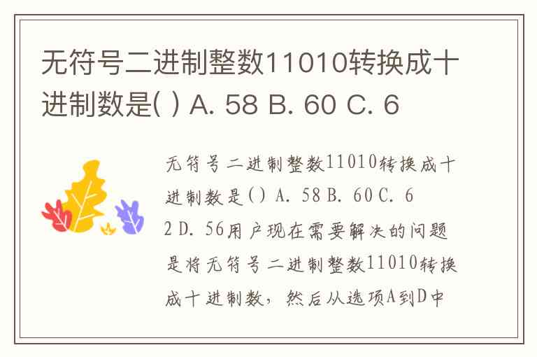 再仔细看用户的问题:“无符号二进制整数11010转换成十进制数是( ) A.58 B.60 C.62 D.56”。