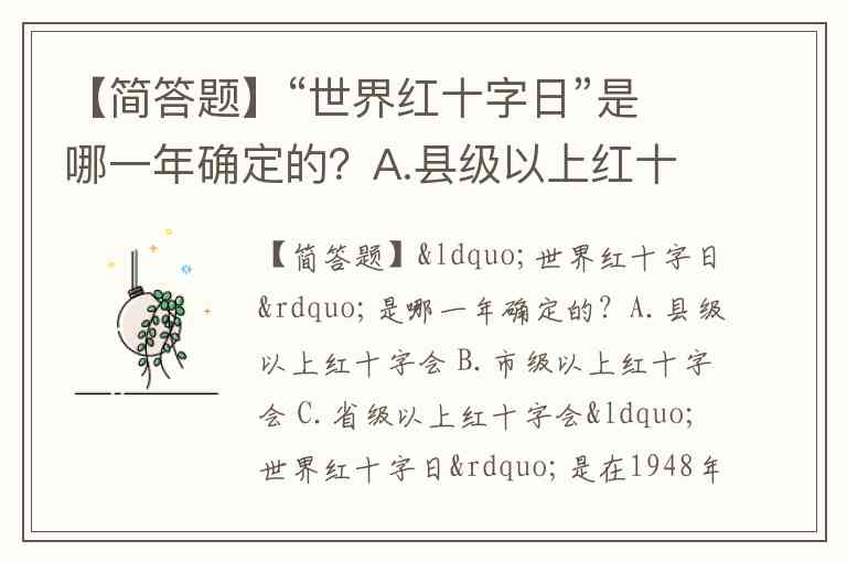 需要说明的是,题目中提供的选项(A.县级以上红十字会;B.市级以上红十字会;C.省级以上红十字会)与问题“世界红十字日是哪一年确定的?”不匹配,可能存在题目设置误差。世界红十字日的确定主体是国际红十字会(现红十字会与红新月会国际联合会前身)的理事会,而非某一级别地方红十字会。