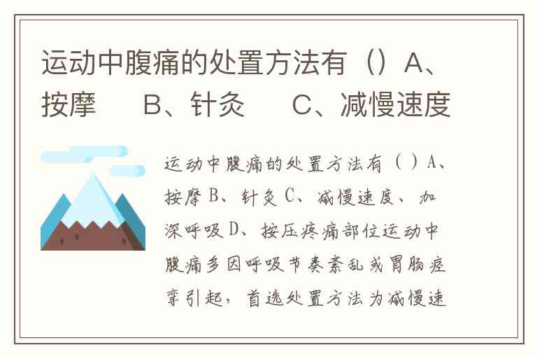 运动中腹痛的处置方法有()A、按摩 B、针灸 C、减慢速度、加深呼吸 D、按压疼痛部位