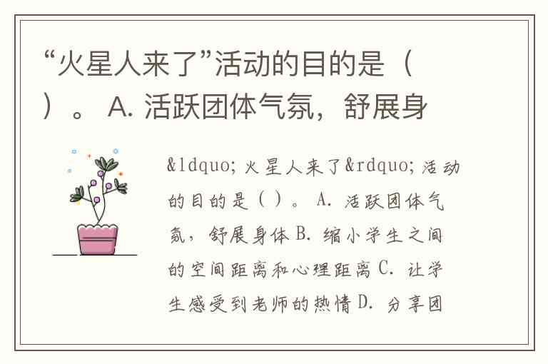 “火星人来了”活动的目的是()。 A. 活跃团体气氛,舒展身体 B. 缩小学生之间的空间距离和心理距离 C. 让学生感受到老师的热情 D. 分享团体沟通和合作的过程