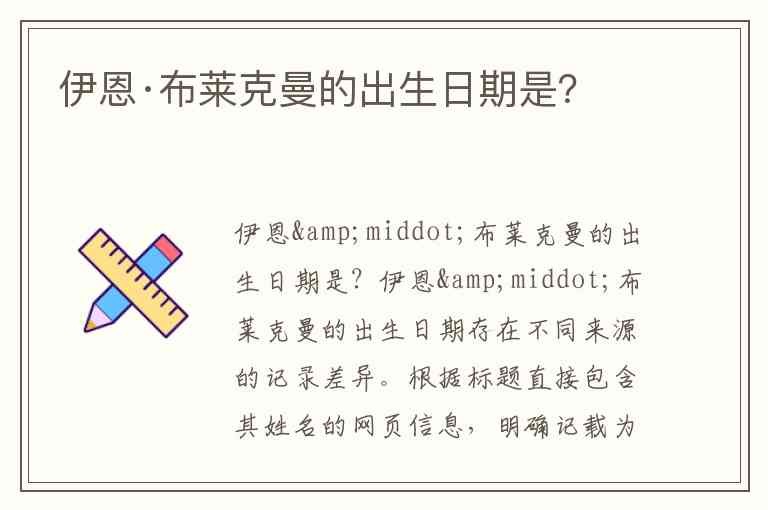 伊恩·布莱克曼的出生日期存在不同来源的记录差异。根据标题直接包含其姓名的网页信息,明确记载为1959年9月2日。不过,其他提及"布莱克曼"的资料中出现了不同日期,如1993年10月27日或1954年5月19日,但这些可能对应其他同名人物(如《无耻之徒》角色弗兰克·加拉格尔的虚构生日)。考虑到信息的直接关联性和姓名匹配度,1959年9月2日是目前最具参考价值的答案。需要注意的是,另有一位知名公众人物罗兰多·布莱克曼(前NBA球员)的出生日期为1959年2月26日,虽同姓且年龄相近,但属于不同个体。