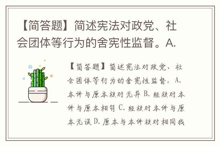 【简答题】简述宪法对政党、社会团体等行为的舍宪性监督。A.本件与原本核对无异 B.经核对本件与原本相符 C.经核对本件与原本无误 D.原本与本件核对相同