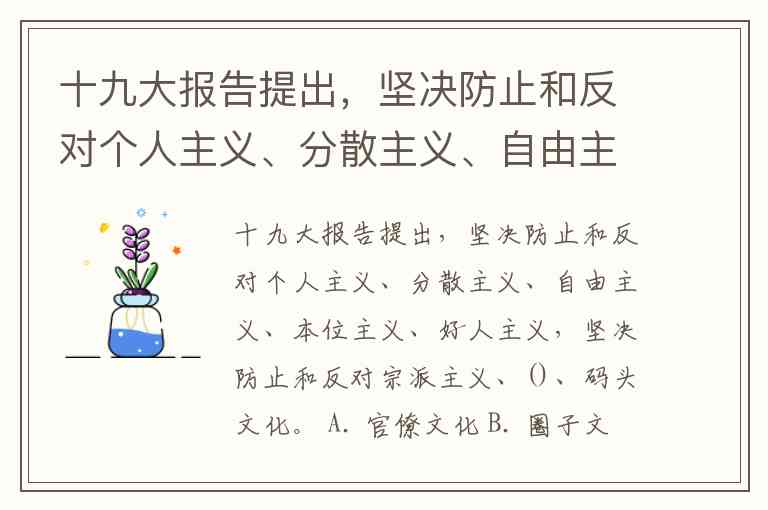 十九大报告提出,坚决防止和反对个人主义、分散主义、自由主义、本位主义、好人主义,坚决防止和反对宗派主义、()、码头文化。 A. 官僚文化 B. 圈子文化 C. 虚荣文化 D. 拜金文化