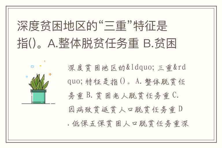 深度贫困地区的“三重”特征是指()。A.整体脱贫任务重 B.贫困老人脱贫任务重 C.因病致贫返贫人口脱贫任务重 D.低保五保贫困人口脱贫任务重